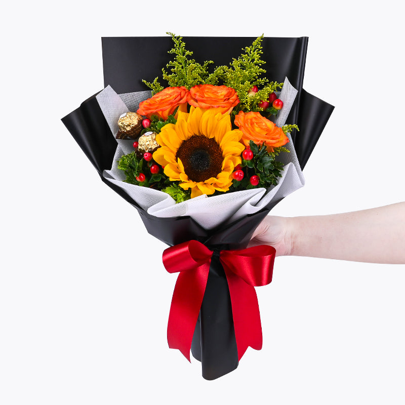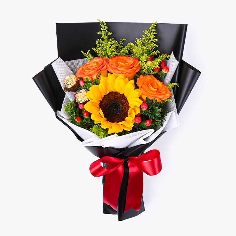 Orange Roses (3 Stalks), Sunflower (1 Stalk), Red Berry (2 Stalks), Yellow Peacock, Ferrero Rocher (2 pieces)
