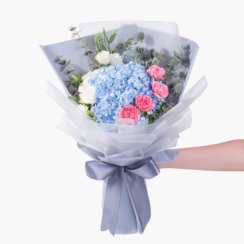 A dreamy flower bouquet that expresses your love and affection. This bouquet leave your special person daydreaming with the light blue hydrangeas, carnations, white eustomas and eryngium carefully and perfectly arranged.
