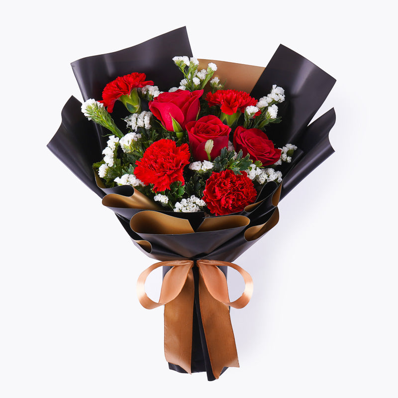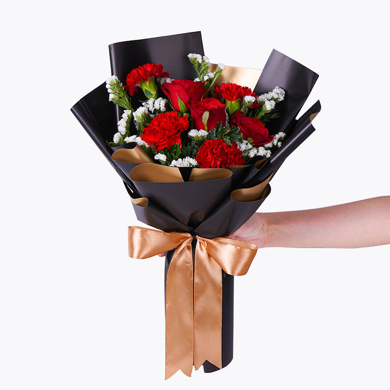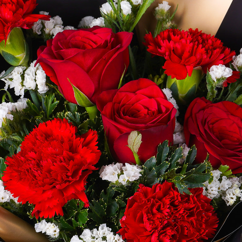 Let your romance blossom like never before - gorgeous red roses and carnations, ornately decorated with sprays of white statice, all tied together with gorgeous hues of gold and black. Our Mirabella flower bouquet is the perfect way to add a touch of magic on just about any day!