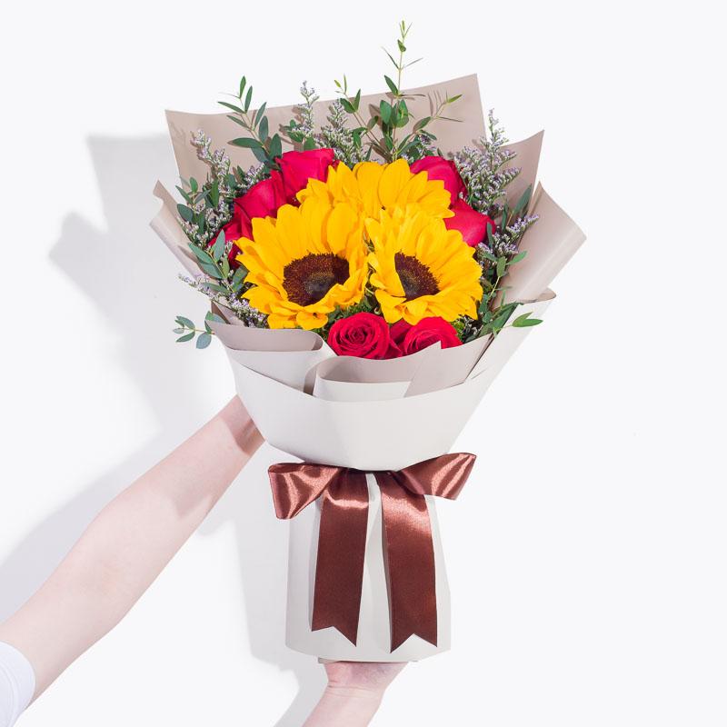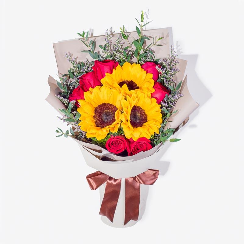 To remind you of the beautiful evening sky, this bouquet was beautiful arranged with a mixture of bright sunflowers and elegant red roses that are surrounded by caspia blues and eucalyptus parvifolias. The perfect bouquet to express your love and contentment.