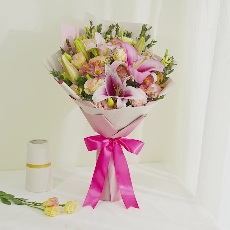 This fragrant flower bouquet is blooming with pink lilies, eustomas and alstromerias. They are commonly known to express your love and appreciation for your beloved friends. Send your best wishes with Sweet Desire and allow our fresh blooms to convey your heartfelt emotions.