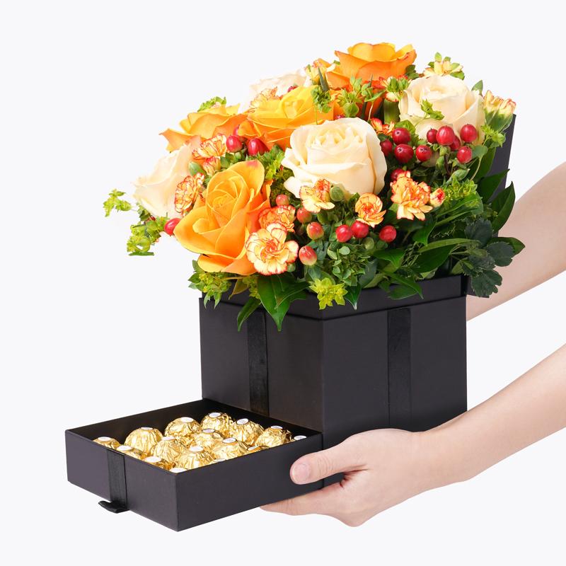 Blooming with brilliant 2 tone yellow orange carnation sprays, amber and champagne roses, this blossoming arrangement is accompanied with red berries, bupleurum and tea leaves. Bring home the essence of Athena with our marvelous Athena Trinity Box.