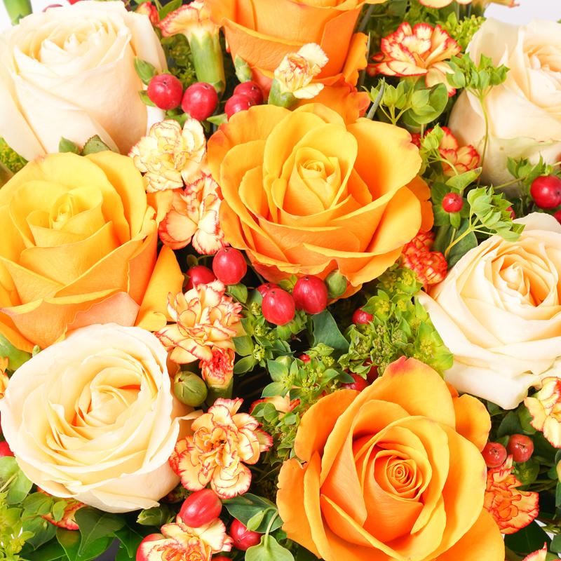 Orange Rose (4 Stalks), Champagne Rose (4 Stalks), Two-Toned Orange Carnation Spray (3 Stalks), Red Berry (2 Stalks), Bupleurum