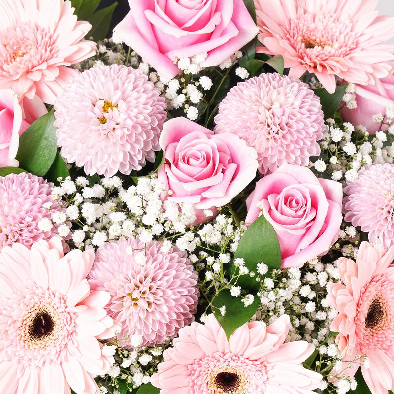 Pink Gerba (5 Stalks), Pink Ping Pong (5 Stalks), Maria Pink Rose (5 Stalks), White Baby Breath, Ruscus