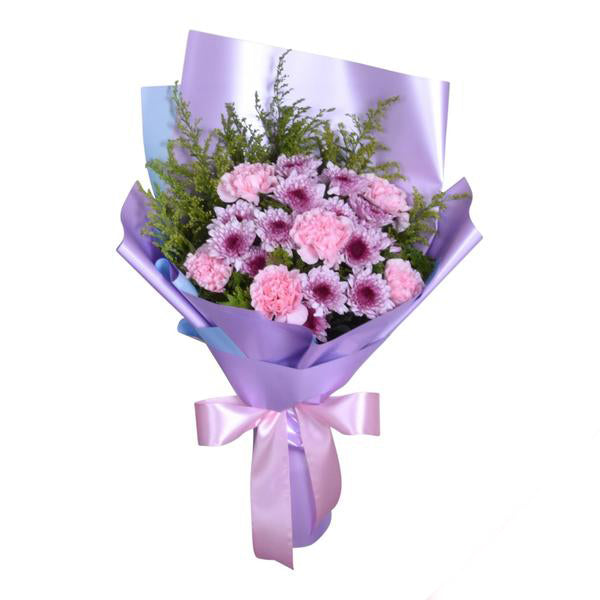 Light Pink Carnation (3 Stalks), Two-toned Purple Pom Pom (3 Stalks), Yellow Peacock