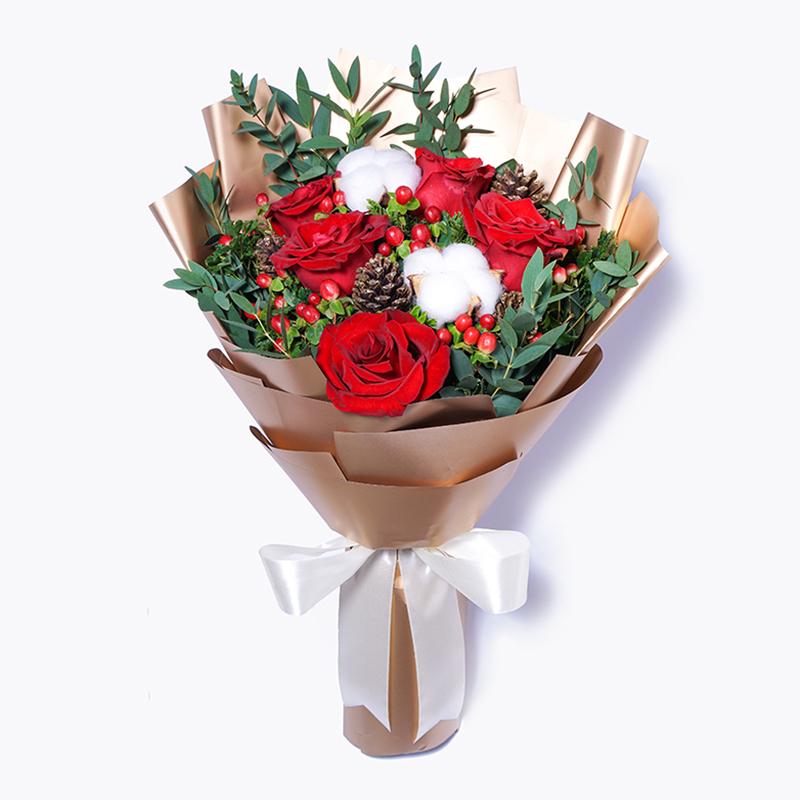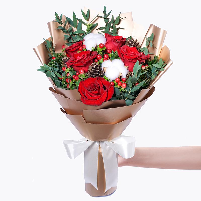 Red Roses (6 Stalks), White Ping Pong (3 Stalks), White Baby Breath, Pine Cone (3 Stalks), Eucalyptus Leaves