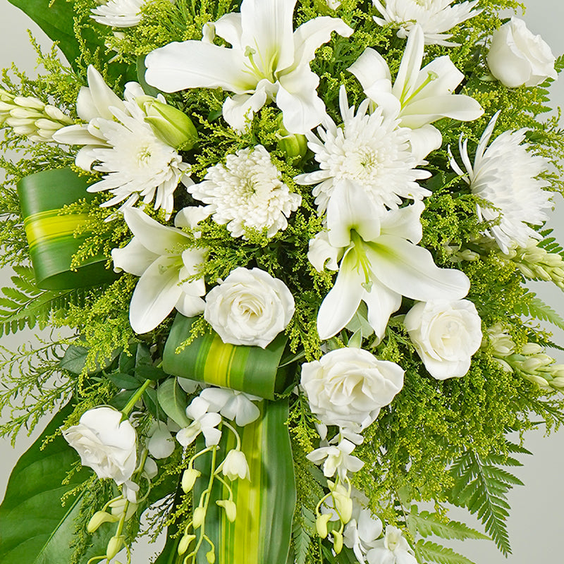 A wonderful condolence stand for funeral services. Lush flowers, compiled in an extraordinary style make this arrangement one of our bestsellers.