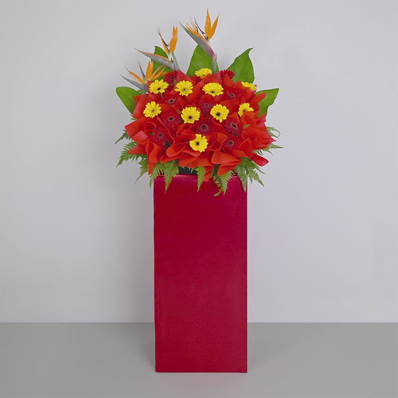 Red Gerbera (10 Stalks), Yellow Gerbera (10 Stalks), Orange Bird of Paradise (3 Stalks)