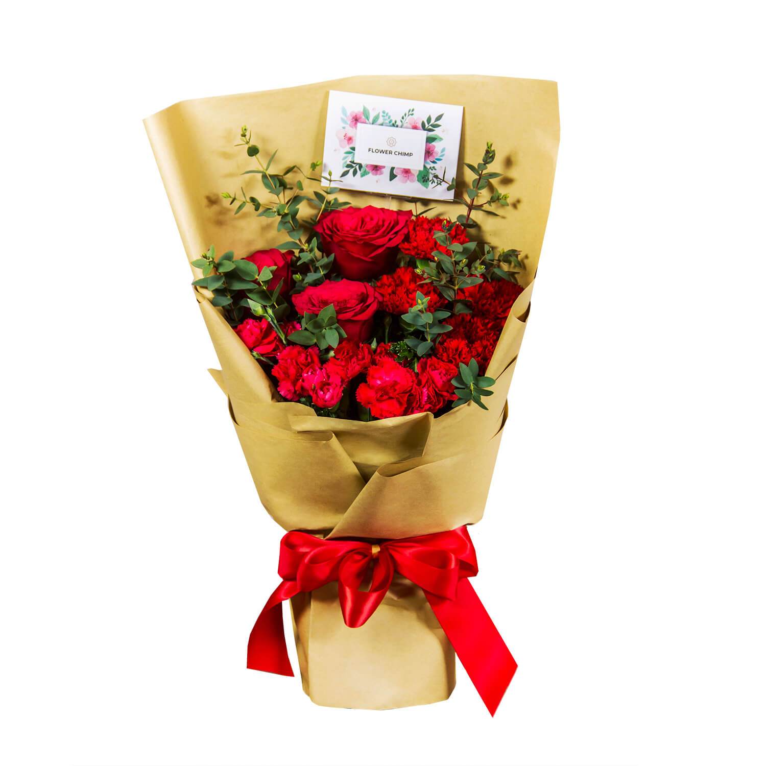 Red Carnation (4 Stalks), Red Rose (3 Stalks), Red Carnation Spray (2 Stalks), Eucalyptus Leaves