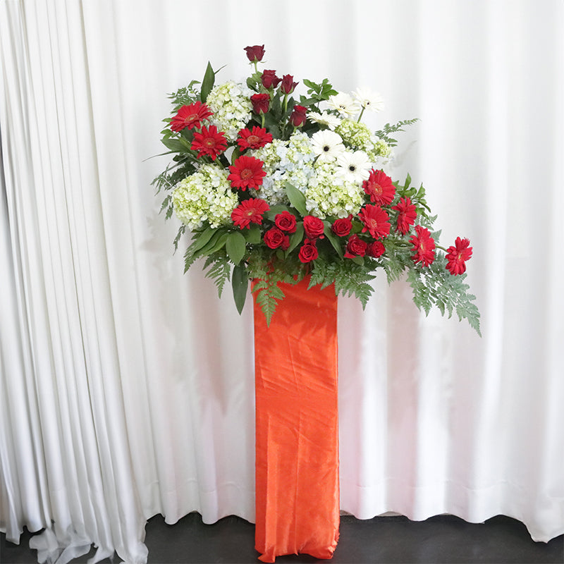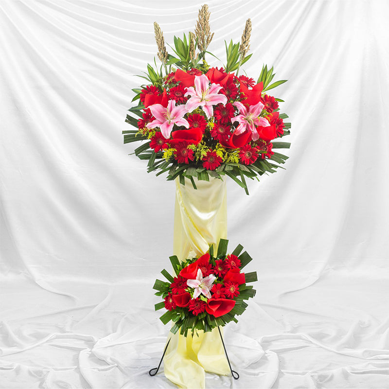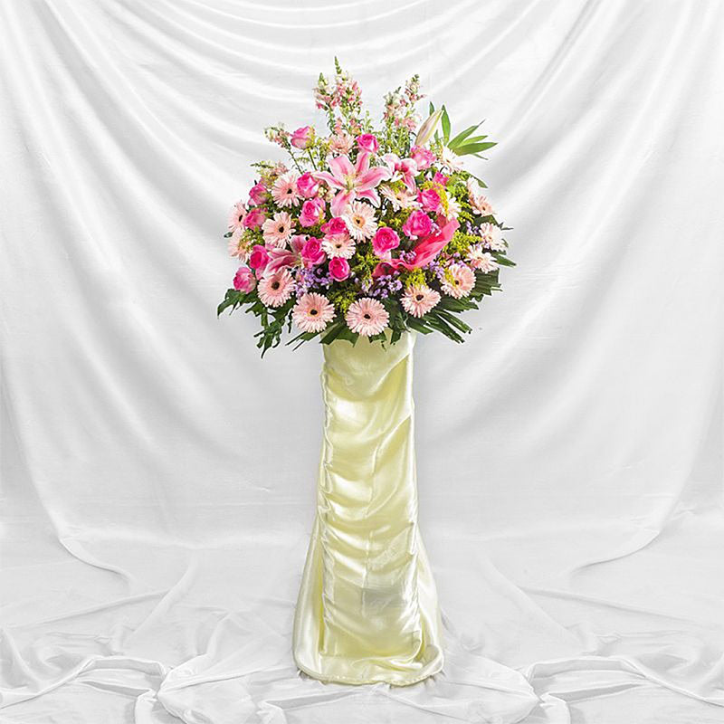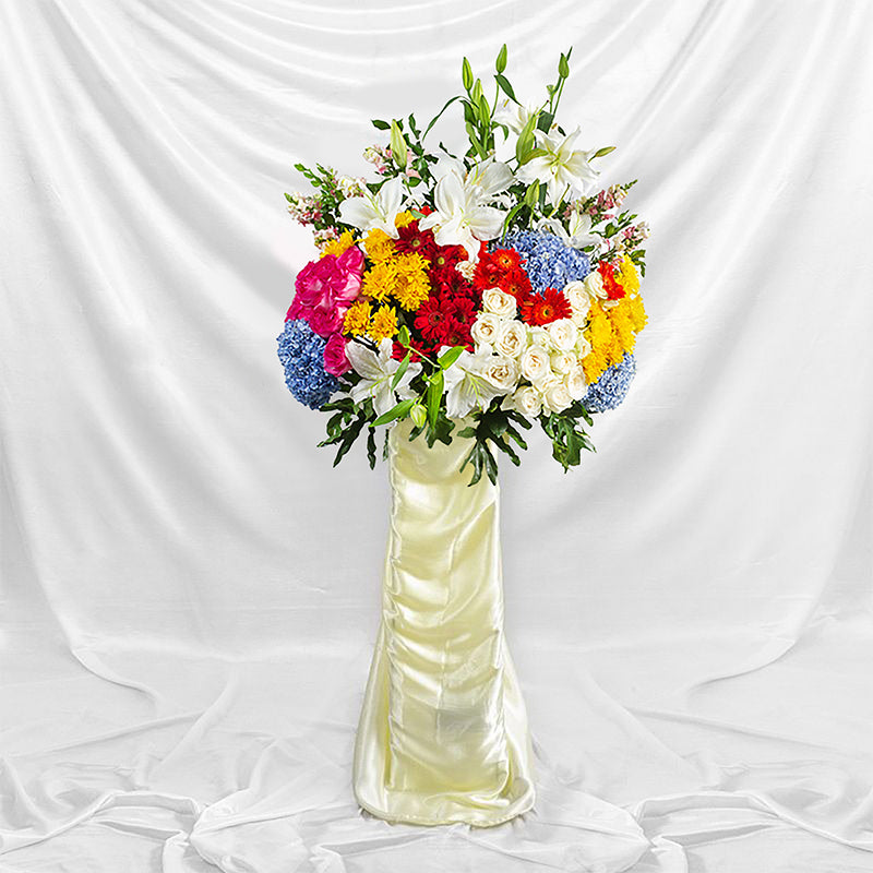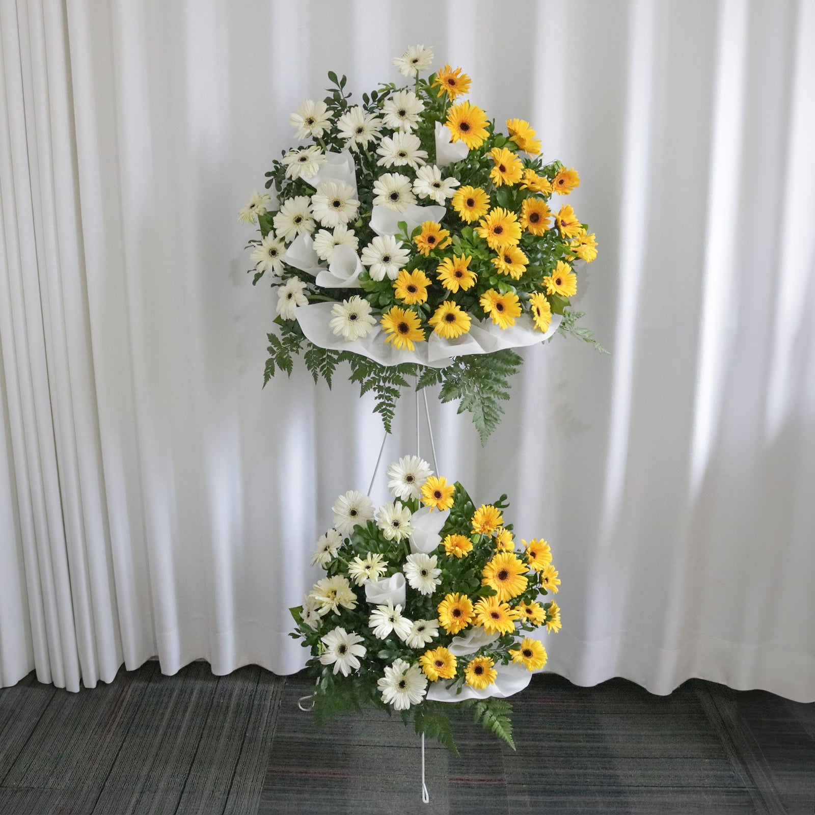 The Standing Bellvanya is a versatile arrangement featuring yellow gerberas, complemented by an array of elegant palm leaves. Its stature allows it to stand out in any setting, offering a symbol of solidarity and respect. Whether it’s to celebrate life’s milestones or to offer comfort in times of sorrow, this arrangement carries a dignified presence.
