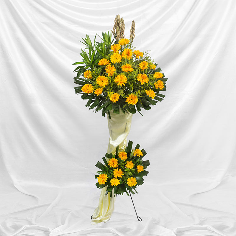 Standing Chara is a harmonious blend of soft pink hues from gerberas, roses, snapdragons, and pink lily. The arrangement is accented with cheerful yellow picocks and serene blue picocks, adding depth and contrast. Supported by the lush greenery of palm leaves, this standing flower arrangement offers a comforting embrace or a joyful celebration, adaptable to both moments of reflection and happiness.