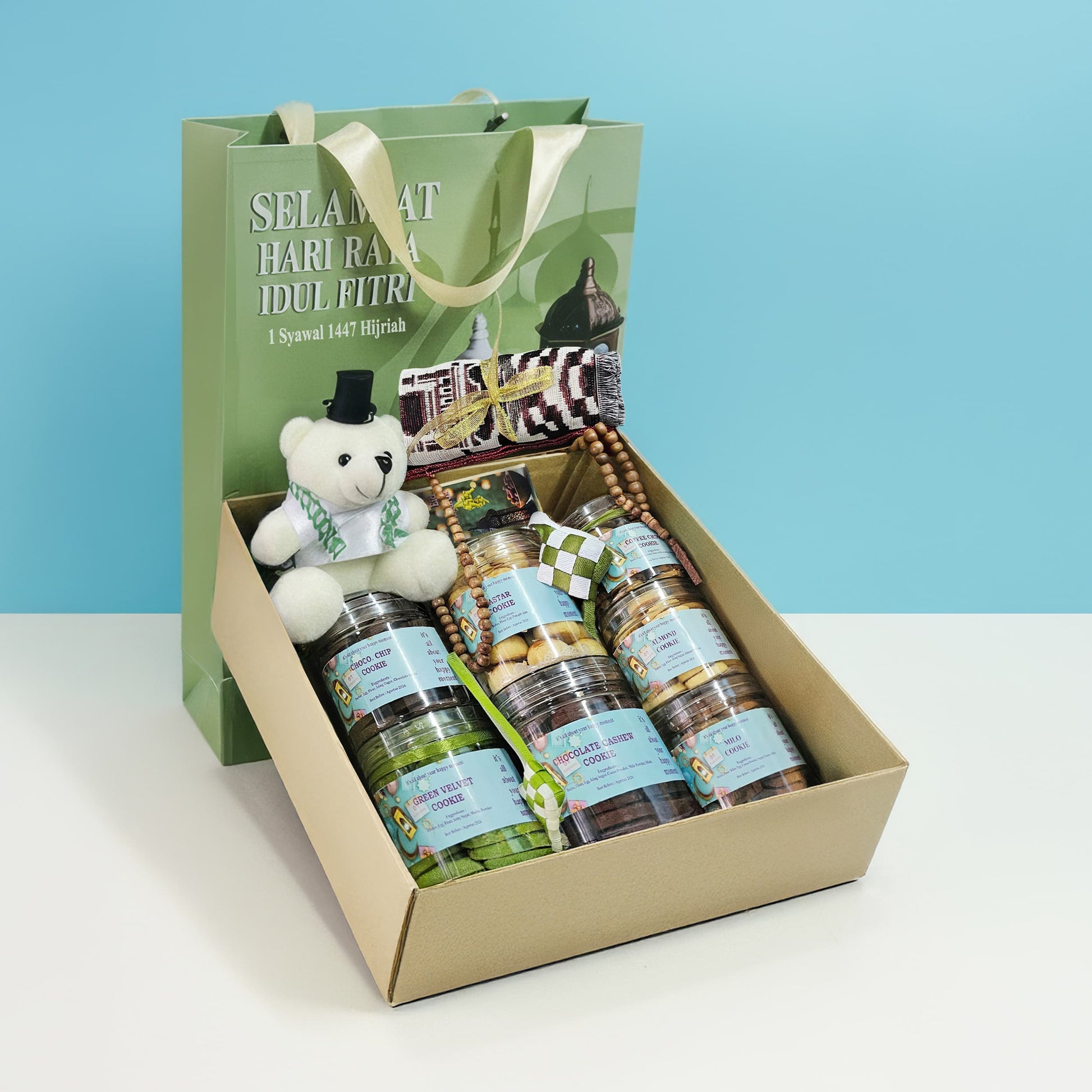 Delight loved ones this Hari Raya Idul Fitri with Gourmet Raya Cookies, a thoughtfully curated gift that brings together premium flavours and festive charm. This delightful Idul Fitri gift features an exquisite selection of gourmet cookies including premium Nastar, Cashew, Mocha Chocochips, Milo, and Green Velvet varieties alongside prayer mat, wooden tasbih, and festive essentials.