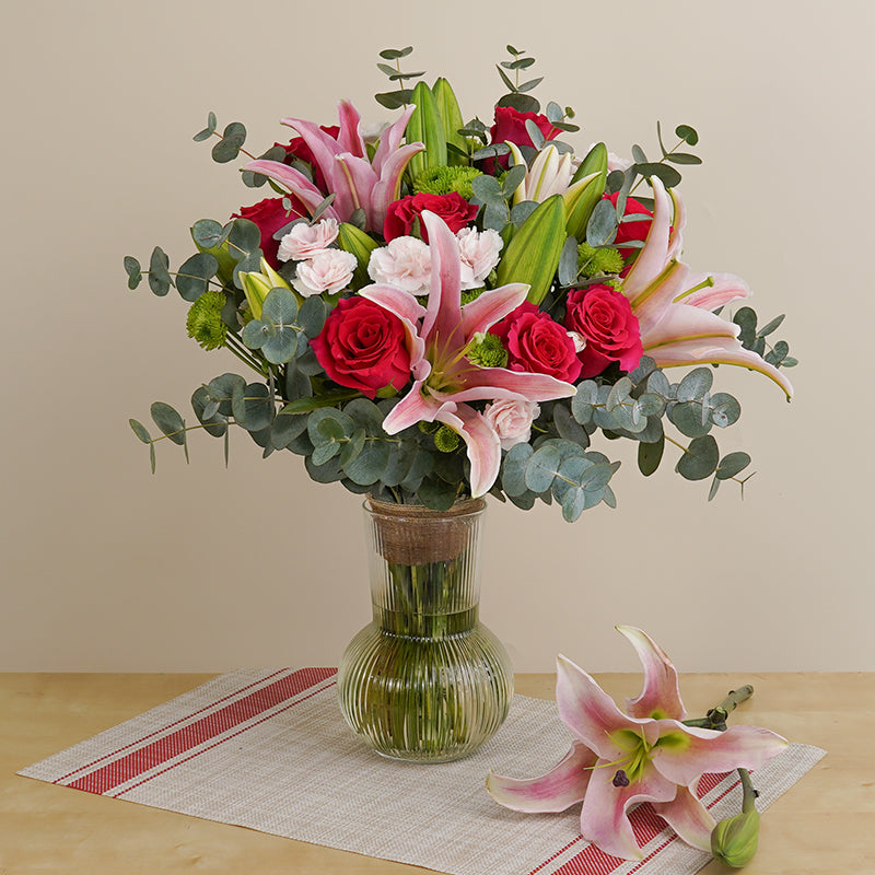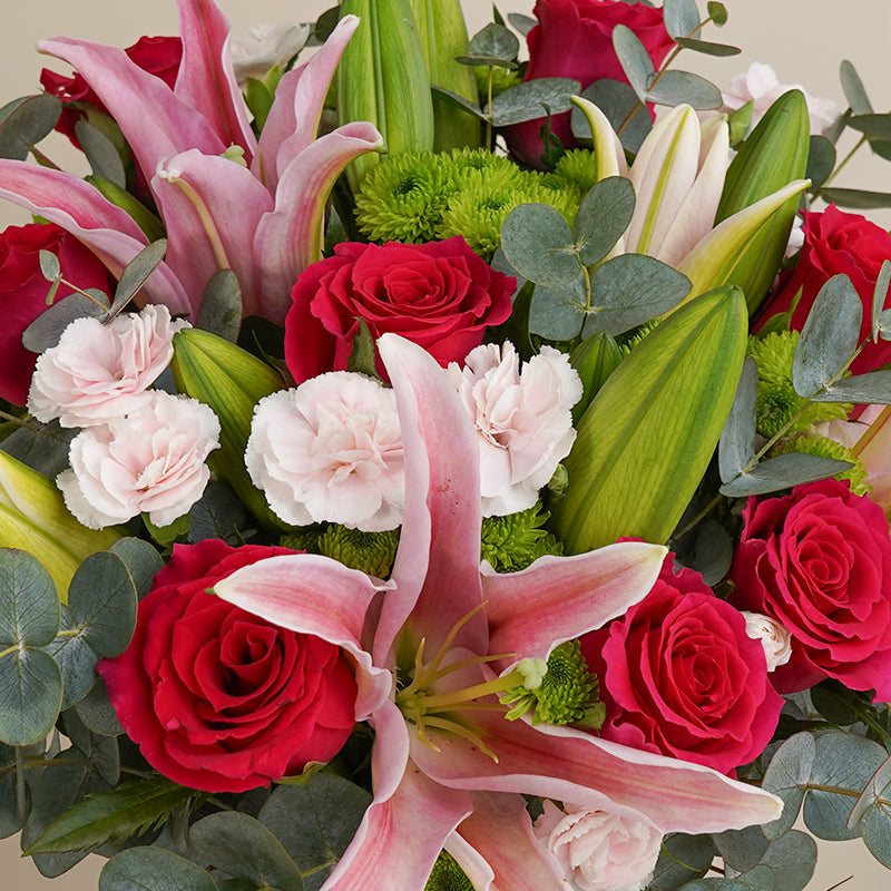 Shocking Pink Rose (8 Stalks), Pink Lily (4 Stalks), Pink Carnation Spray (3 Stalks), Green Button (5 Stalks)