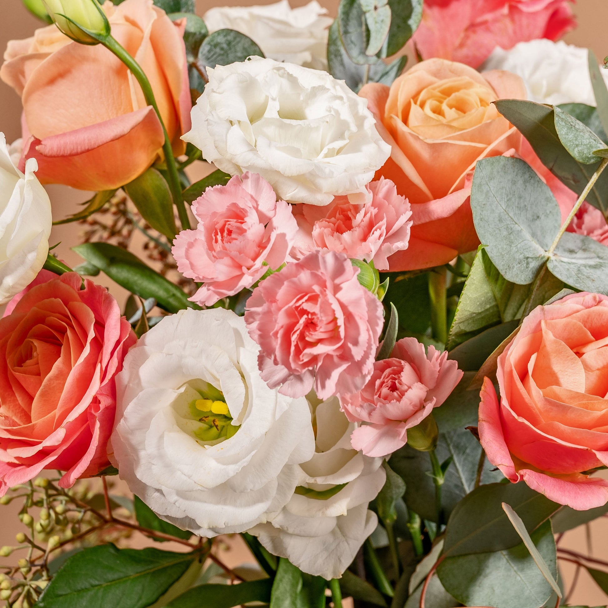 Miss Piggy Rose (5 Stalks), White Eustoma (2 Stalks), Light Pink Carnation (3 Stalks), Eucalyptus Leaves
