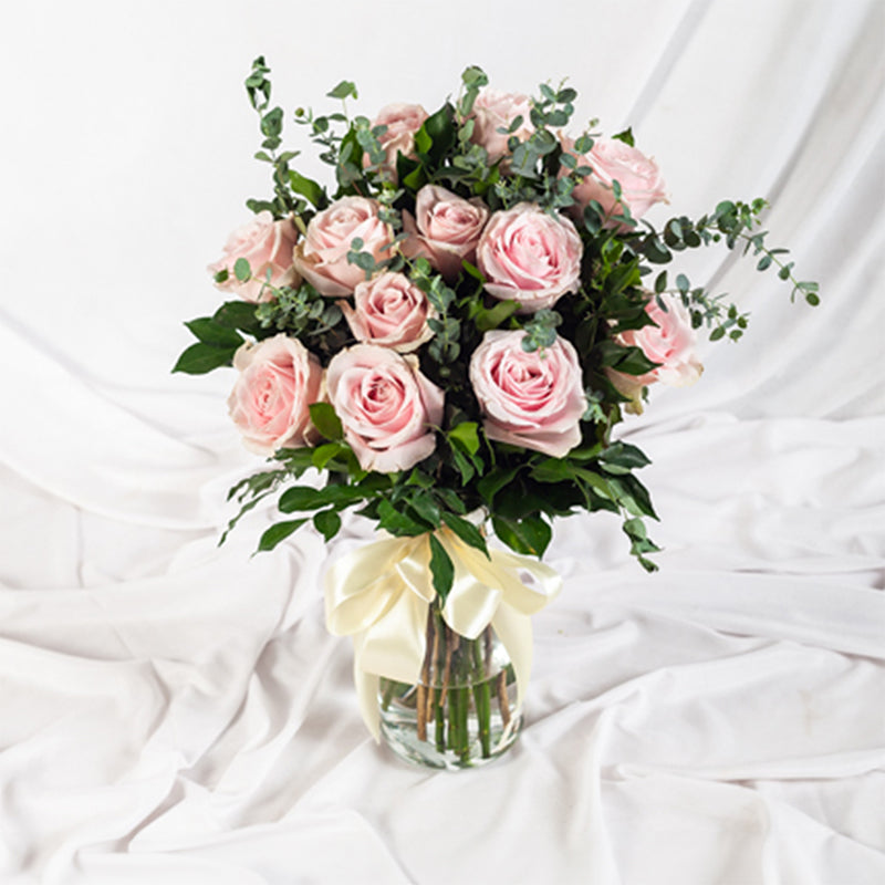 Sweet Pink Roses (12 Stalks), Baby Blue Eucalyptus (2 Stalks)