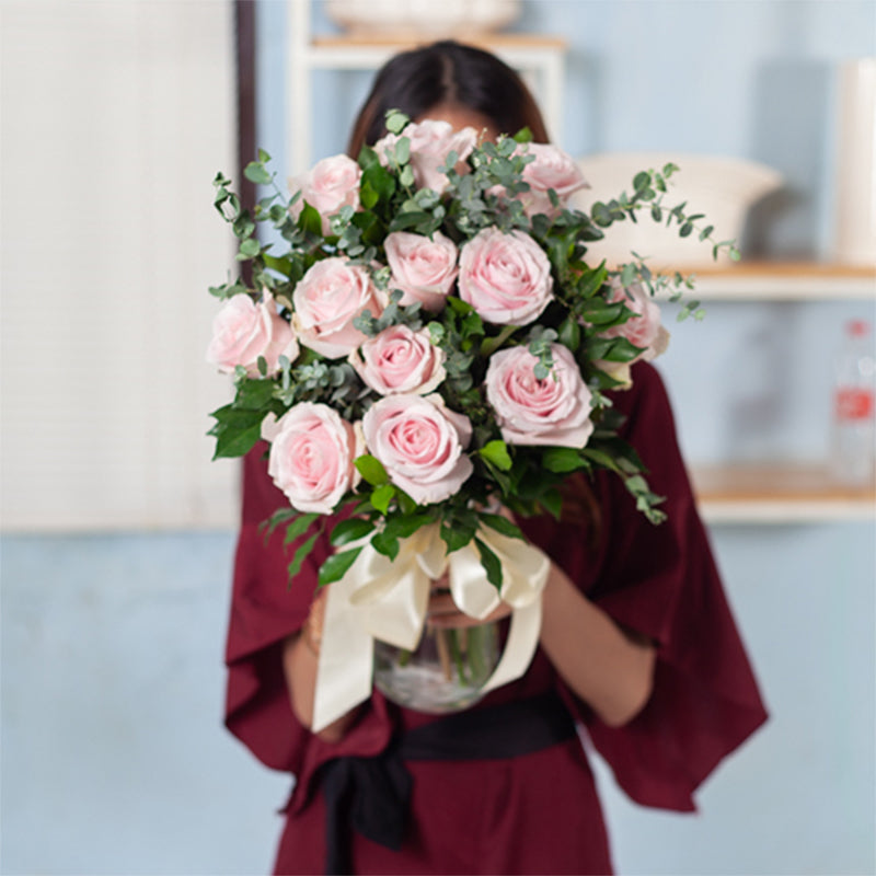 Meet Naomi, your go-to for a bit of everyday lovely. It’s a simple mix of 12 soft pink roses for a bit of cheer, a handful of tea leaves for that fresh green look, and a couple of eucalyptus twigs for a hint of calm. All snug in a no-fuss vase that fits just right wherever you need a splash of sweet and cozy.