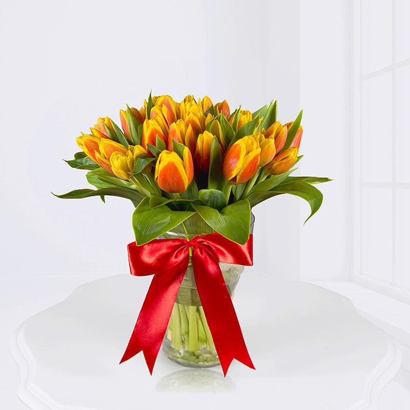 A bouquet of dashing two-tone yellow-orange tulips accompanied by cordylines. - This arrangement is the perfect reminder to your loved one of their beauty and grace - a gift that will light up the atmosphere of the room whilst it represents your love and admiration.