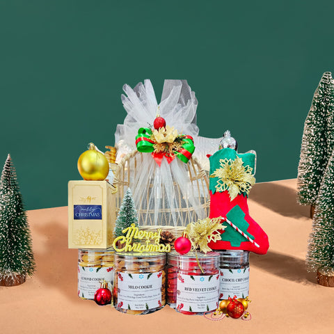 Make the holidays extra magical with Santa's Christmas Hamper that brings festive joy and sweet indulgence together beautifully. This delightful collection features freshly baked Red Velvet, Milo, Choco Chip, and Almond cookies, paired with a Santa sock, cheerful Christmas ornaments, and a decorative Christmas ribbon—all presented in an exclusive woven rattan box.