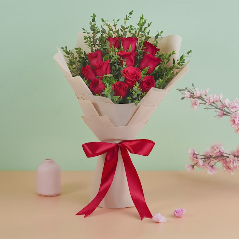 This popular 12 red roses Korean style bouquet symbolizes your true love. It can be used to represent perfect beauty or to express your complete love and gratitude for your special someone.