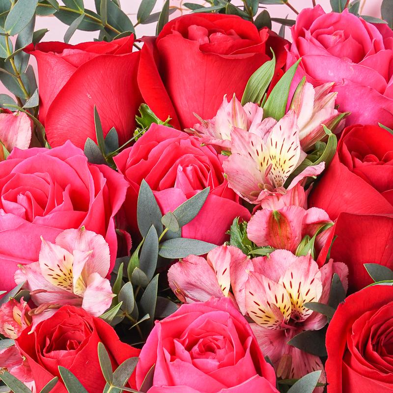 Red Rose (5 Stalks), Shocking Pink Rose (4 Stalks), Pink Alstroemeria (4 Stalks), Eucalyptus Leaves
