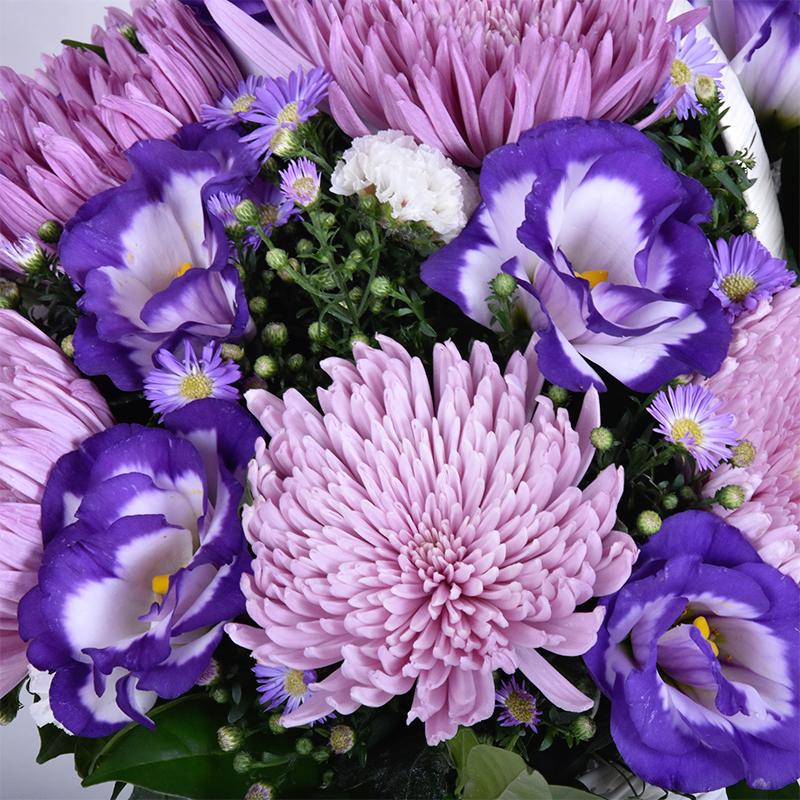 Purple Spider Mum (8 Stalks), White Statice (3 Stalks), Two-Toned Purple Eustoma (3 Stalks), Purple Peacock