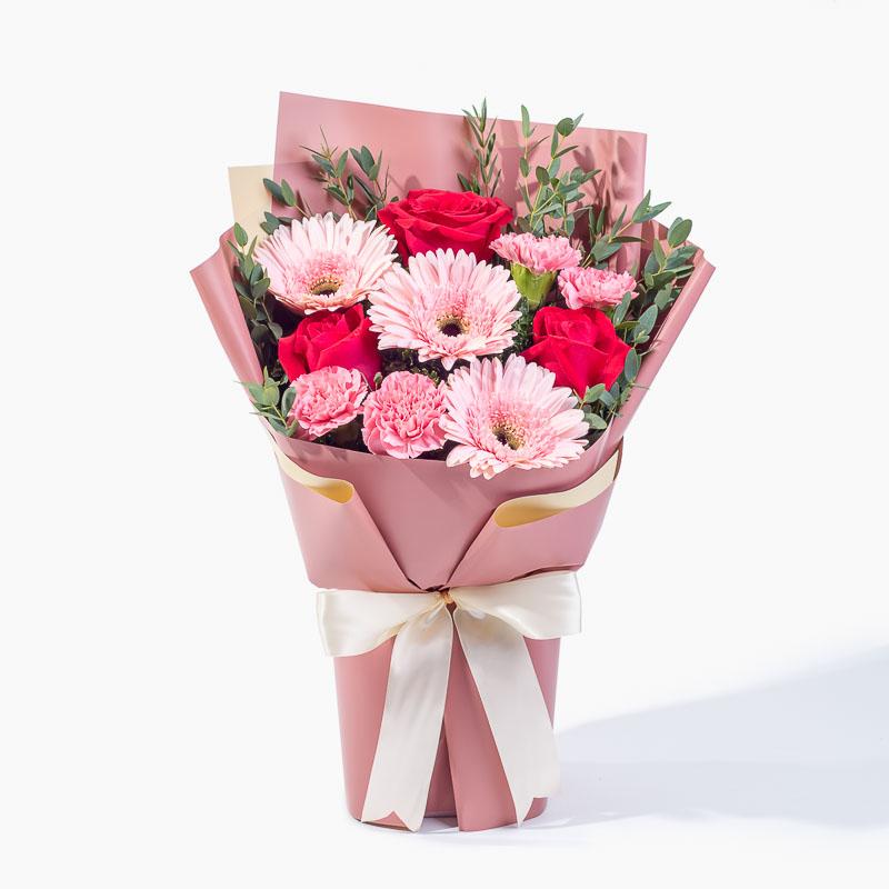 Red Roses (3 Stalks), Pink Carnations (4 Stalks), Pink Gerbera (3 Stalks), Eucalyptus Leaves