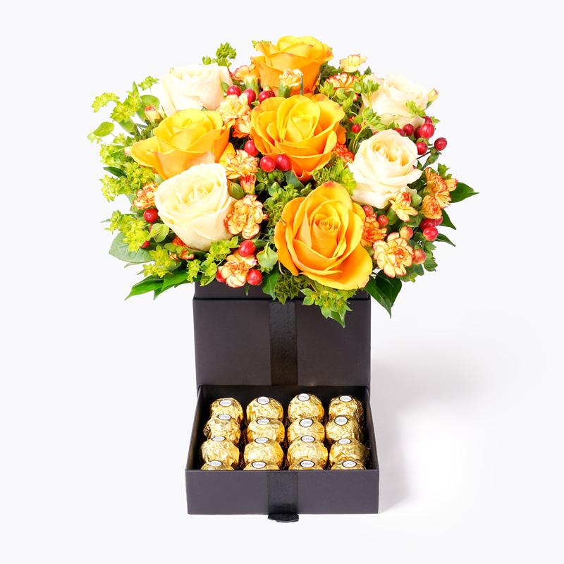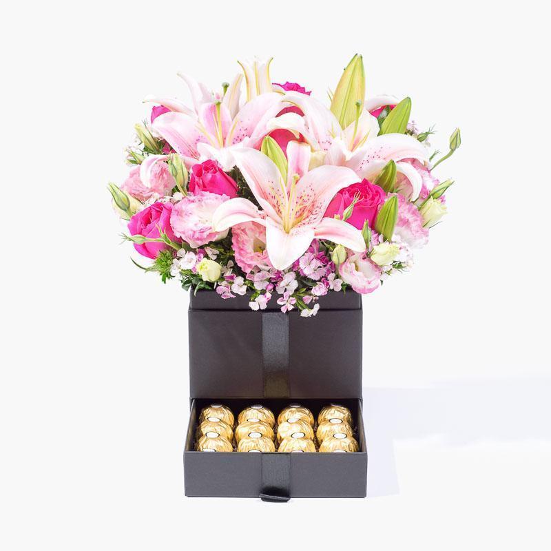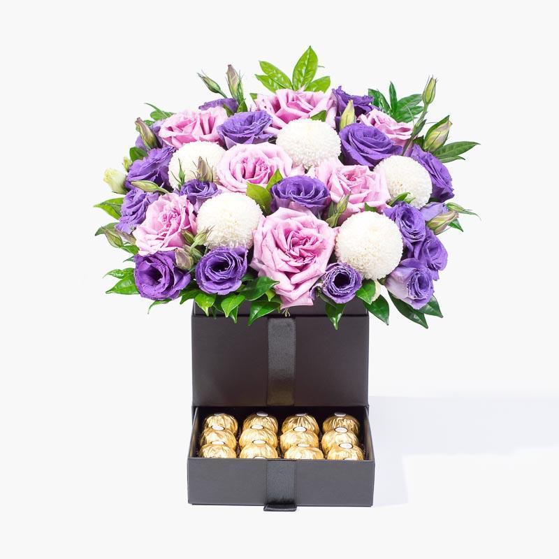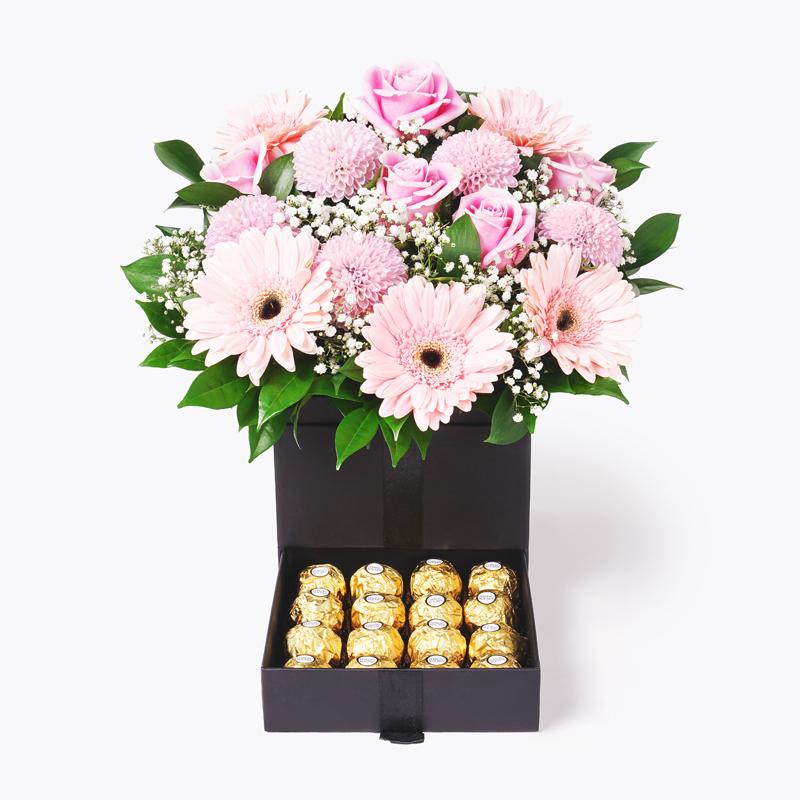 Flourish into the feeling of love with bashful pink maria roses and sweet william, adorned with tea leaves and ruscuses. Our enchanting Aphrodite Trinity Box is sure to ravish you, and sweep you off your feet with every beautiful bloom.